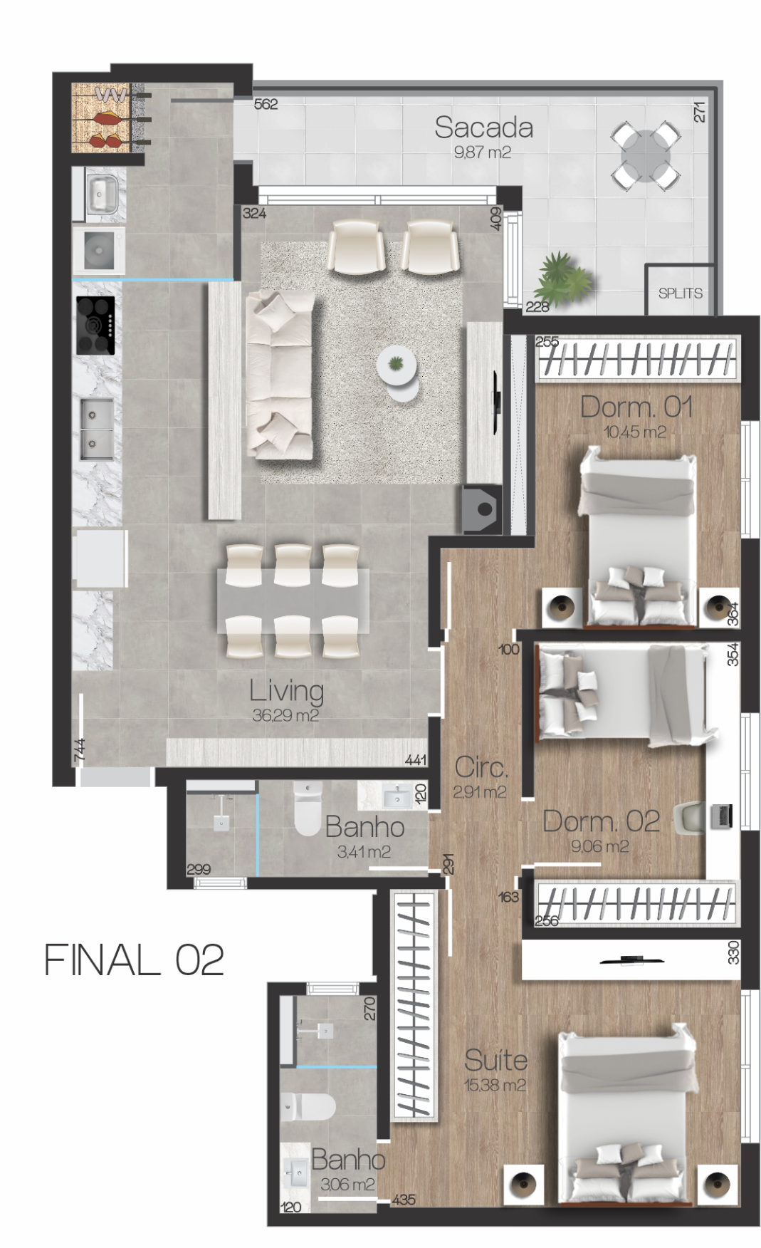 2 banheiros, sendo 1 suíte, living integrado, sacada, lavanderia com churrasqueira, área de serviço, sala e cozinha conjugadas, espera para splits, rebaixe de gesso, piso laminado e de porcelanato, brinquedoteca, bicicletário, salão de festas, academia, coworking (escritório conjugado), lareira a lenha com dutos individuais, acabamento em massa corrida, aberturas de PVC, 2 elevadores, espera para água quente, aquecimento de água solar, reutilização da água da chuva, monitoramento por câmeras, 2 vagas de garagem, carregamento de veículos elétricos.
